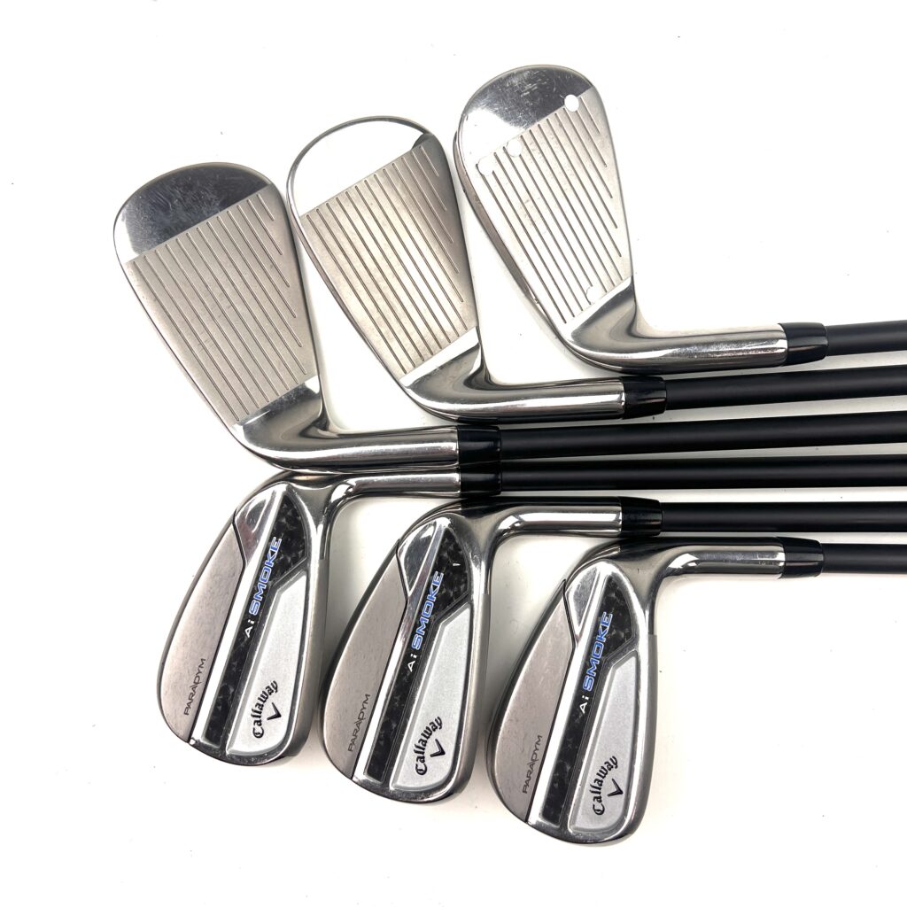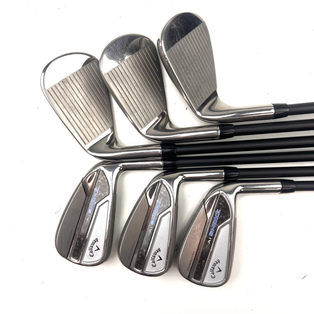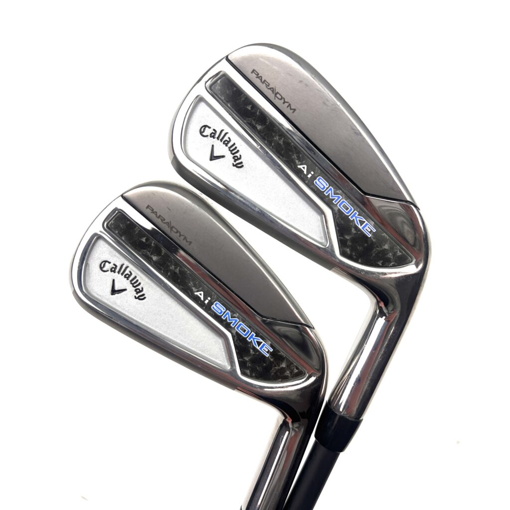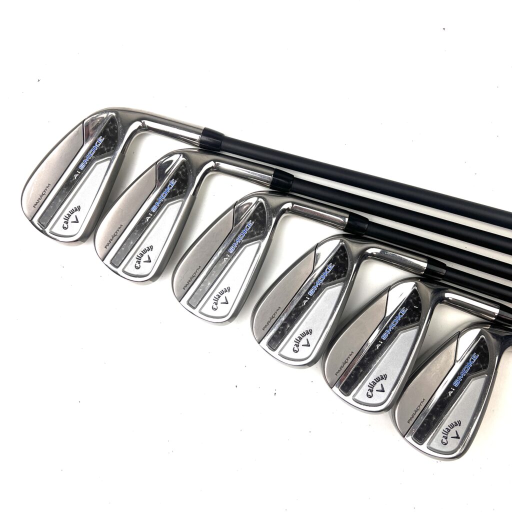 The Callaway Paradym AI Smoke Irons are crafted to deliver a high level of performance, blending advanced technology with a sleek, modern design. These irons feature a sophisticated “A.I.-Designed Face Architecture,” which optimizes face thickness for enhanced ball speed and distance, even on off-center hits. This technology ensures consistent performance across the face, helping golfers achieve greater distance and accuracy.