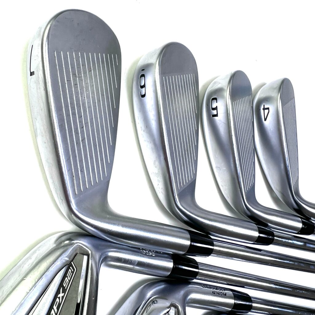 The JPX921 Hot Metal irons incorporate a one-piece design with a focus on increasing the moment of inertia (MOI), which provides greater forgiveness on off-center hits and ensures more consistent distance and accuracy. The low and deep center of gravity (CG) promotes higher ball flights and easier launches, enhancing overall playability from various lies. The modern, sleek profile includes a thin top line and minimal offset, appealing to golfers who appreciate a contemporary aesthetic combined with advanced performance technology. Overall, the Mizuno JPX921 Hot Metal irons offer a high-performance option that balances cutting-edge technology with a refined design, ideal for golfers looking to enhance their game with a forgiving and distance-focused iron set.