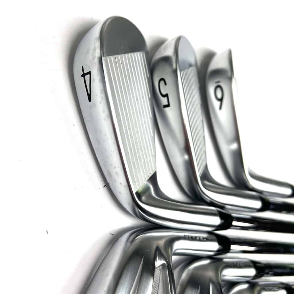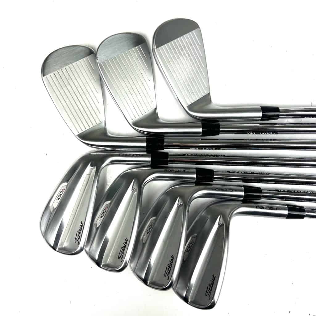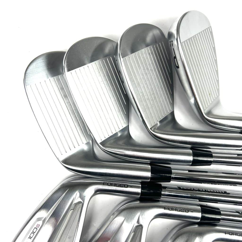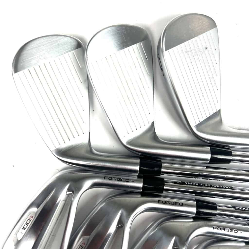 The T100S 2021 irons feature a forged construction with a high-strength steel face, which maximizes ball speed and increases distance. These irons include a high-density tungsten weighting system that positions weight in the heel and toe areas to boost the moment of inertia (MOI) and lower the center of gravity (CG). This design enhances forgiveness on off-center hits and helps achieve a higher launch angle, providing more consistent ball flights and greater distance control.