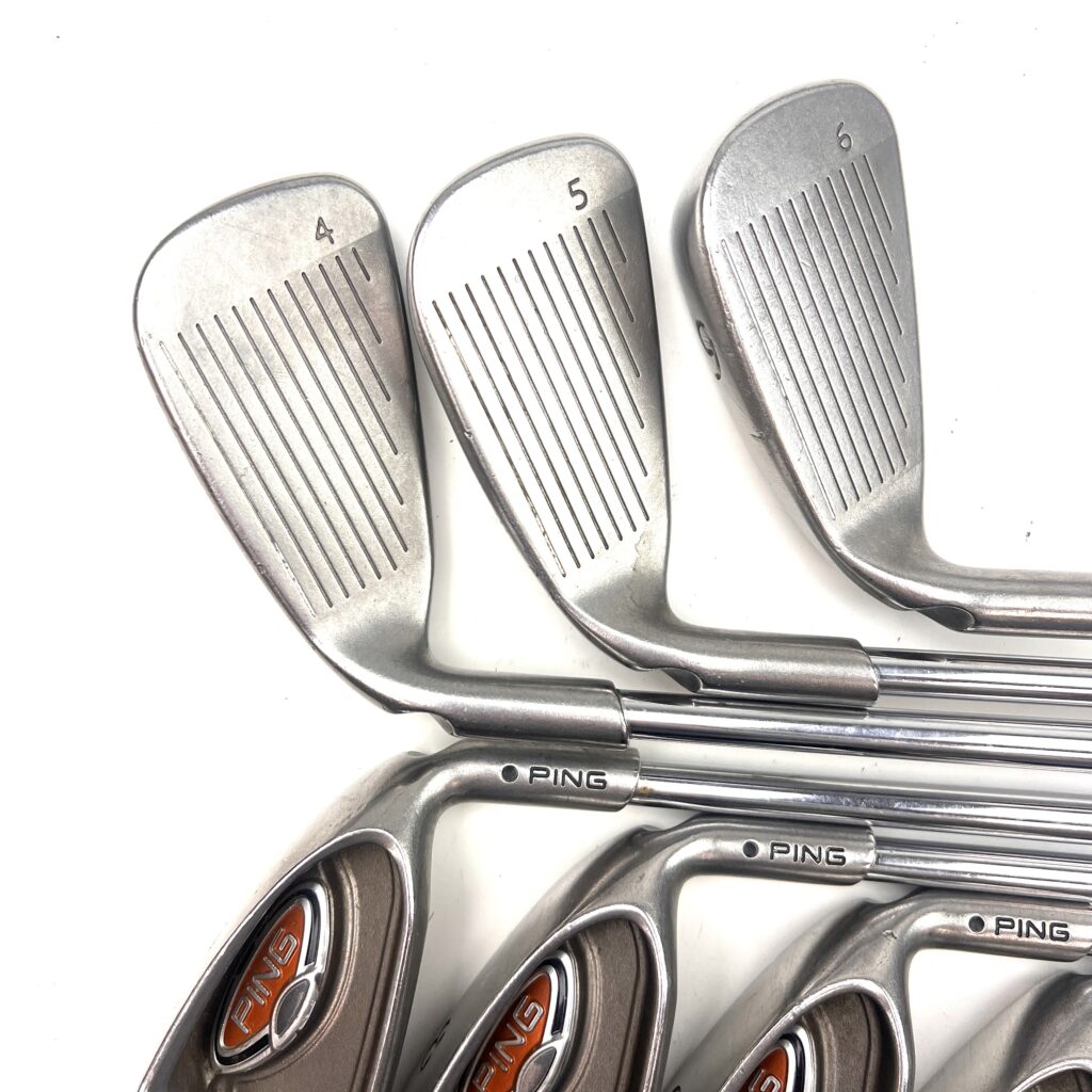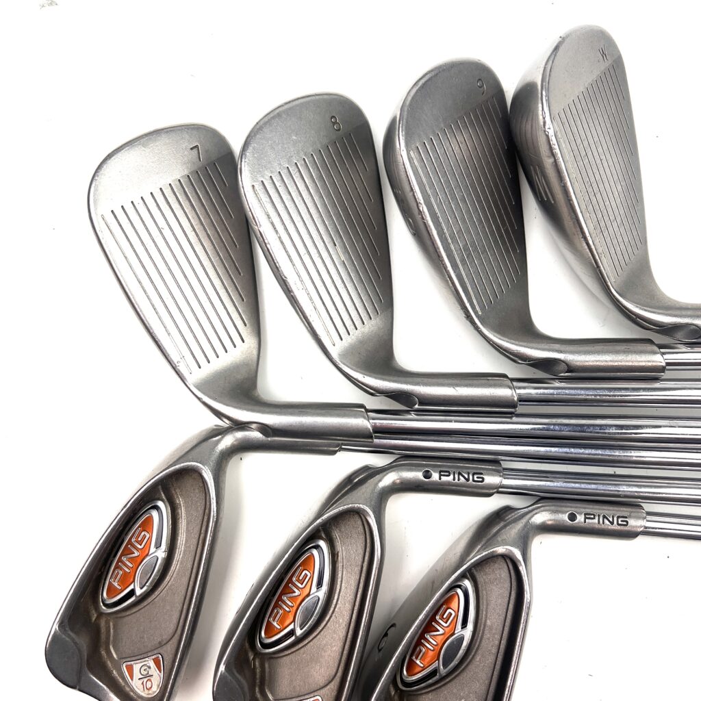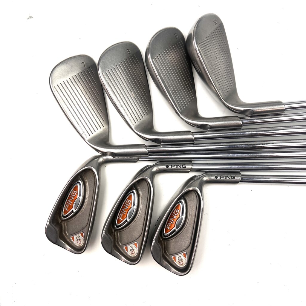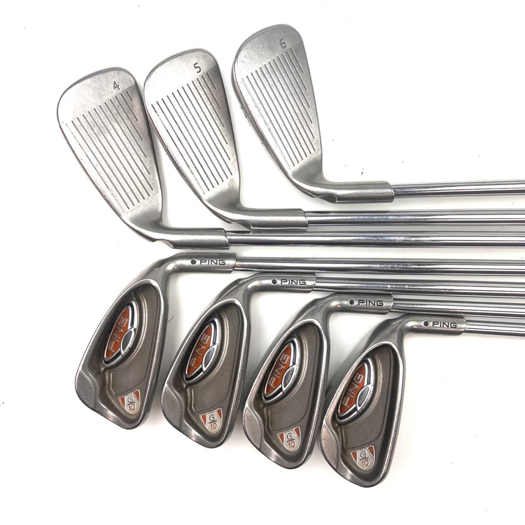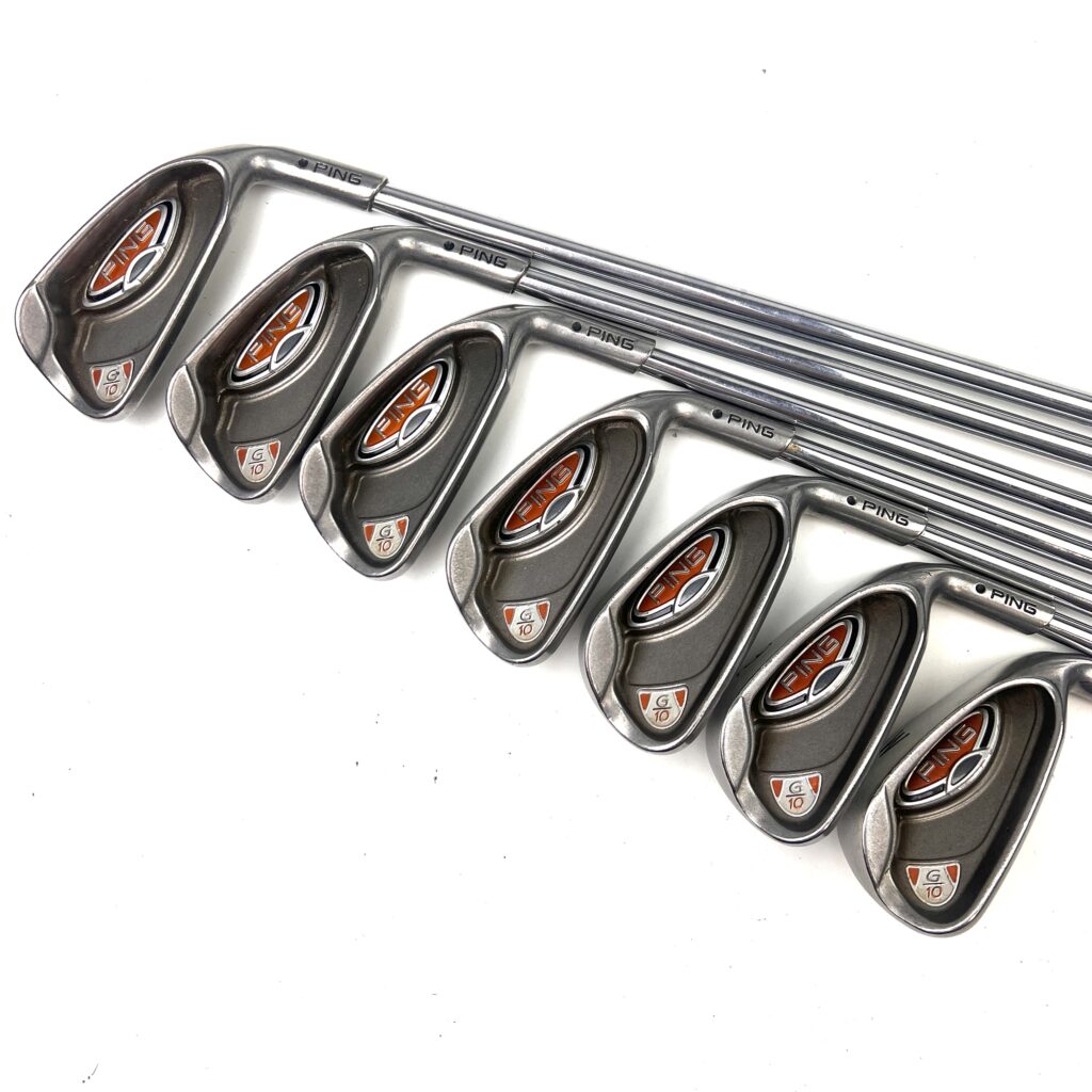 The G10 irons are characterized by their oversized heads, which help promote a higher launch and increased forgiveness. The design includes a low and deep center of gravity (CG) to assist in achieving higher ball flights and easier launches, making the irons more forgiving and playable from various lies. The wide sole of the G10 irons helps reduce turf interaction issues, preventing digging and improving overall playability. Additionally, the sleek, modern profile features a thin top line and minimal offset, appealing to golfers who appreciate both performance and aesthetics. Overall, the Ping G10 irons deliver a high-performance option that combines advanced forgiveness and distance with a user-friendly design, suitable for golfers looking to enhance their game with forgiving and versatile irons.