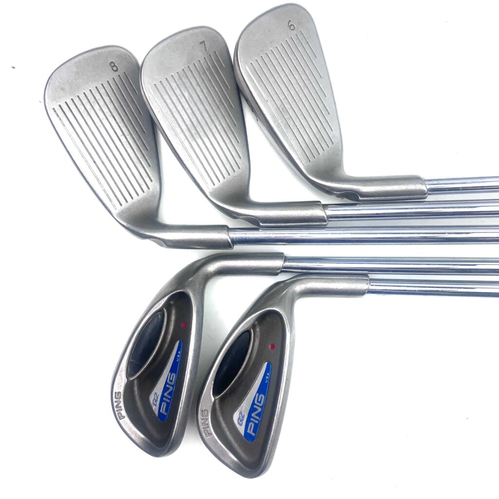 The G2 irons are characterized by their oversized heads, which help promote a higher launch and more forgiving playability from various lies. The design includes a low and deep center of gravity (CG) to assist in achieving higher ball flights and easier launches, while the wide sole helps reduce the chances of digging into the turf. The irons also feature a sleek, modern look with a thin top line and minimal offset, appealing to golfers who appreciate both performance and aesthetics. Overall, the Ping G2 irons deliver a high-performance option that combines advanced forgiveness with a contemporary design, making them suitable for golfers seeking improved distance and playability in their iron play.