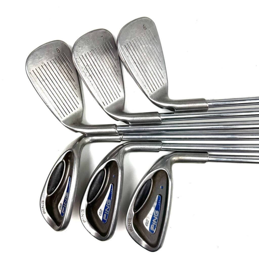 The G2 irons are characterized by their oversized heads, which help promote a higher launch and more forgiving playability from various lies. The design includes a low and deep center of gravity (CG) to assist in achieving higher ball flights and easier launches, while the wide sole helps reduce the chances of digging into the turf. The irons also feature a sleek, modern look with a thin top line and minimal offset, appealing to golfers who appreciate both performance and aesthetics. Overall, the Ping G2 irons deliver a high-performance option that combines advanced forgiveness with a contemporary design, making them suitable for golfers seeking improved distance and playability in their iron play.