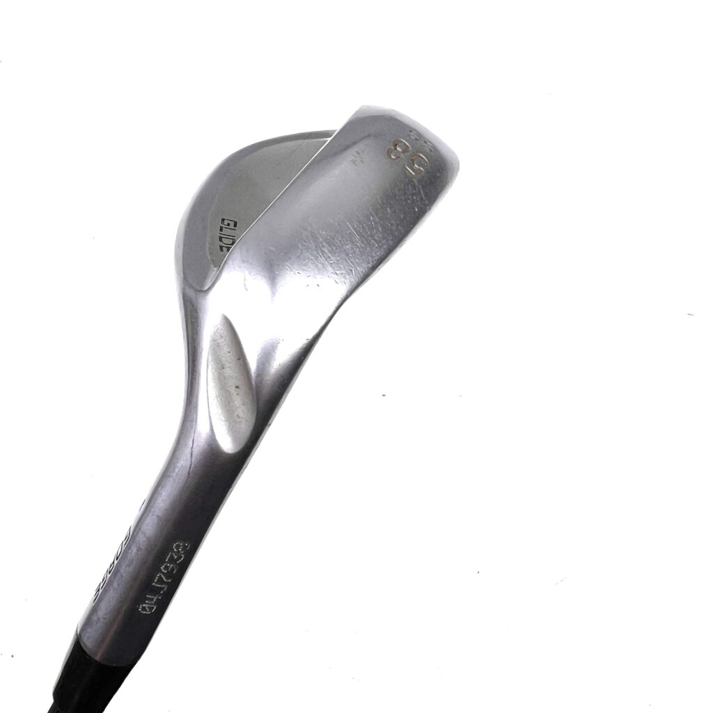 The Ping Glide Wedge is meticulously designed to enhance short-game performance by increasing spin and consistency. Key features include the Dyla-wedge grip, which is longer to facilitate gripping down for better trajectory control, and the CFS Wedge shaft, optimized for weight, flex, and balance. The head is made from moisture-repelling 431 stainless steel, ensuring durability and consistent performance. Additionally, the Glide Wedge offers three sole options with added bounce and loft-optimized Gorge grooves, providing versatility and improved shot-making from various lies. These features combine to deliver precise, controlled shots with enhanced spin and consistency.