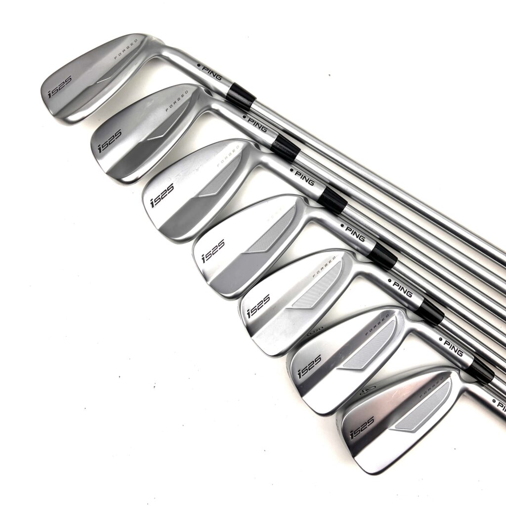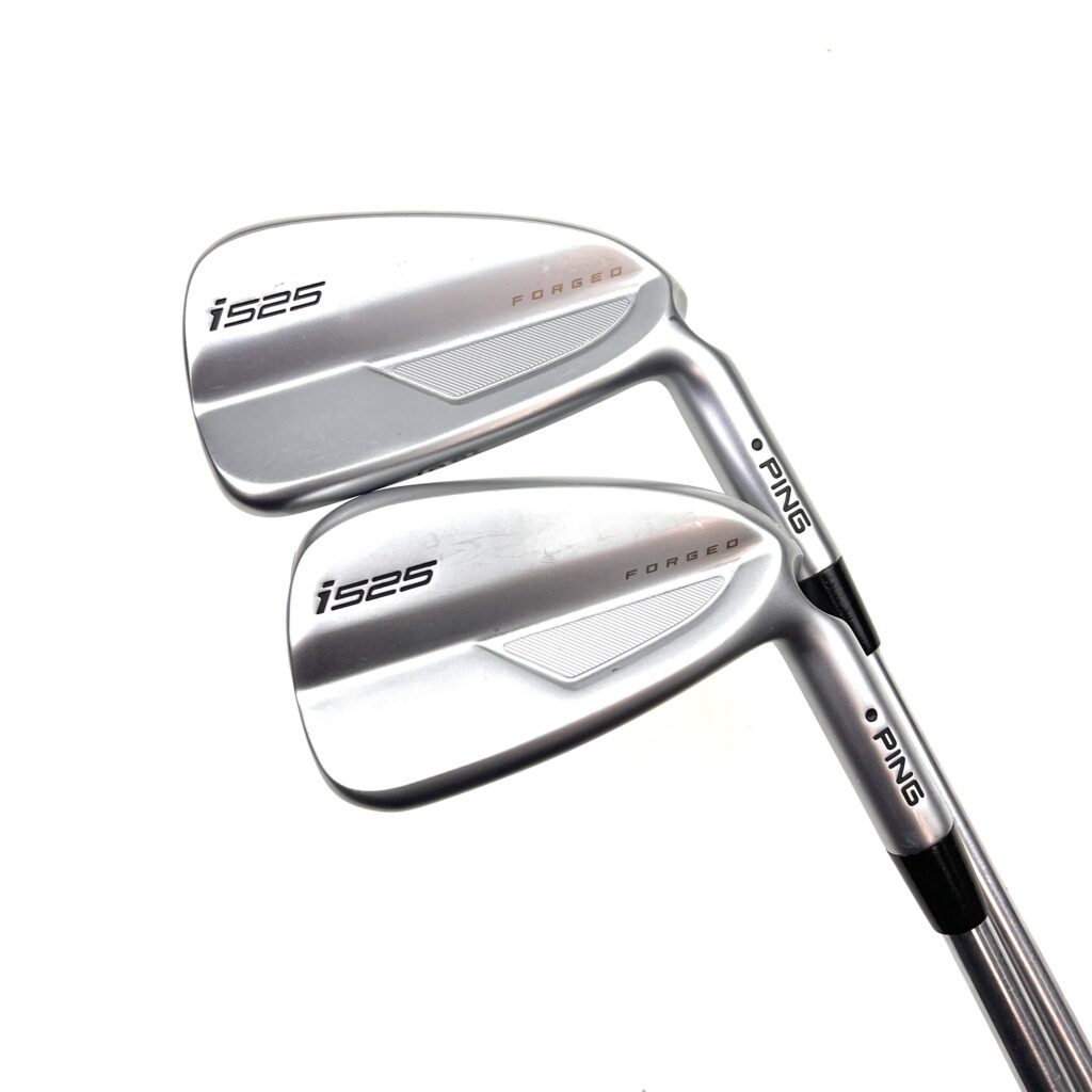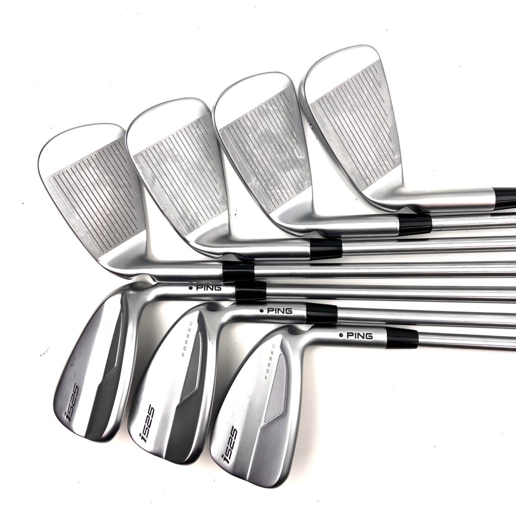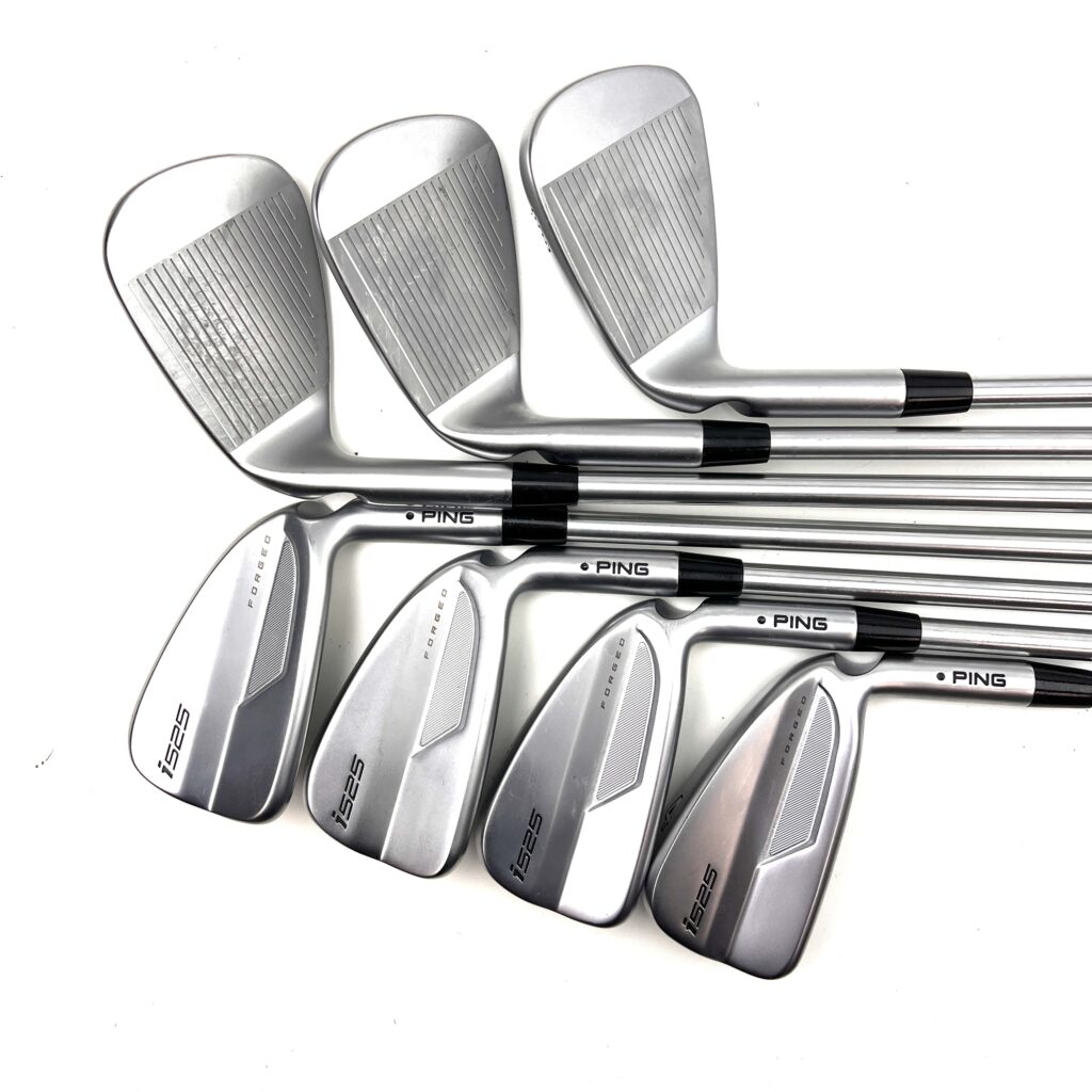 The Ping i525 irons are designed for golfers seeking a blend of distance, precision, and a soft feel. These irons feature a “Forged, Maraging Steel Face” paired with a stainless steel body, which enhances ball speed and distance while providing a solid feel at impact. The “MicroMax” grooves offer consistent spin and control across various lies, making these irons versatile on the course. With a sleek, compact design, the i525 irons appeal to players who prefer a traditional look without sacrificing modern performance.
