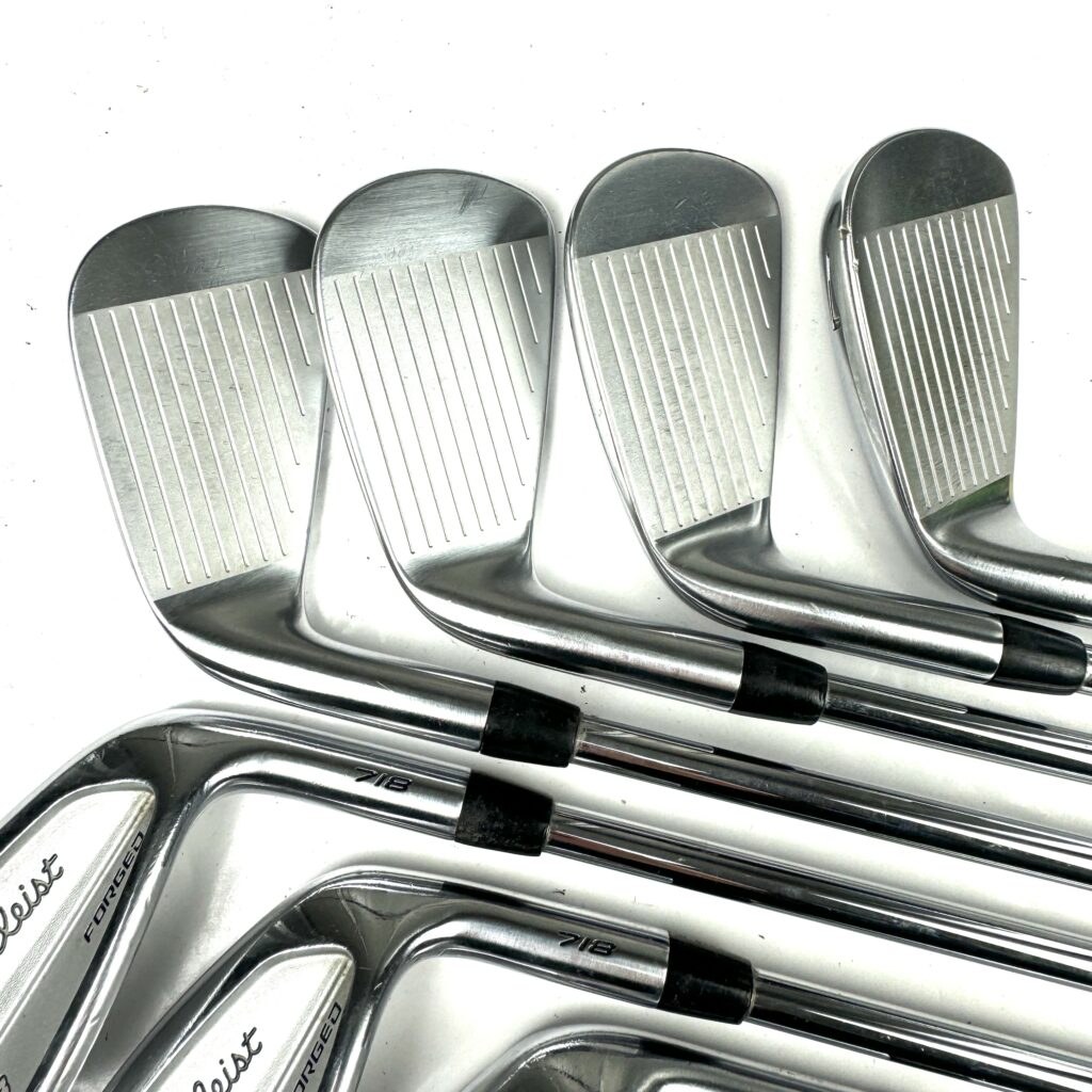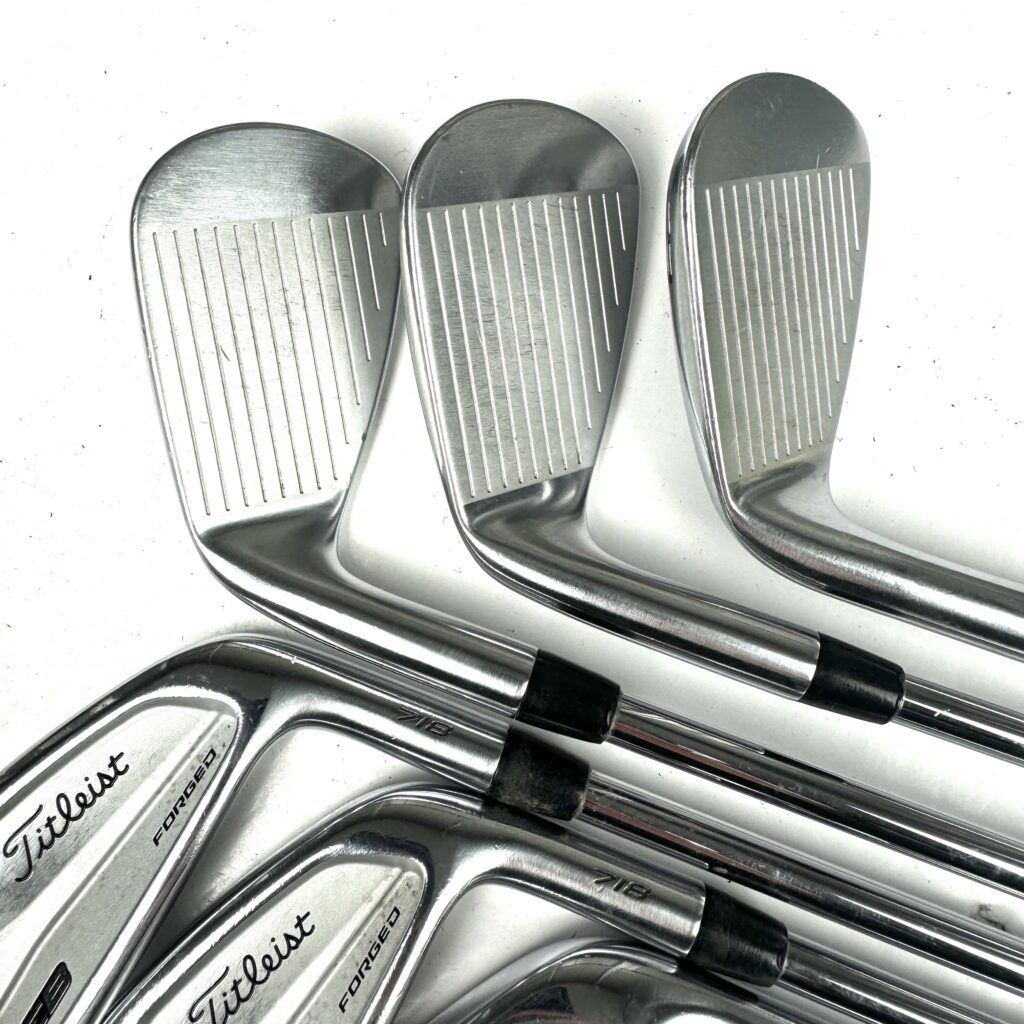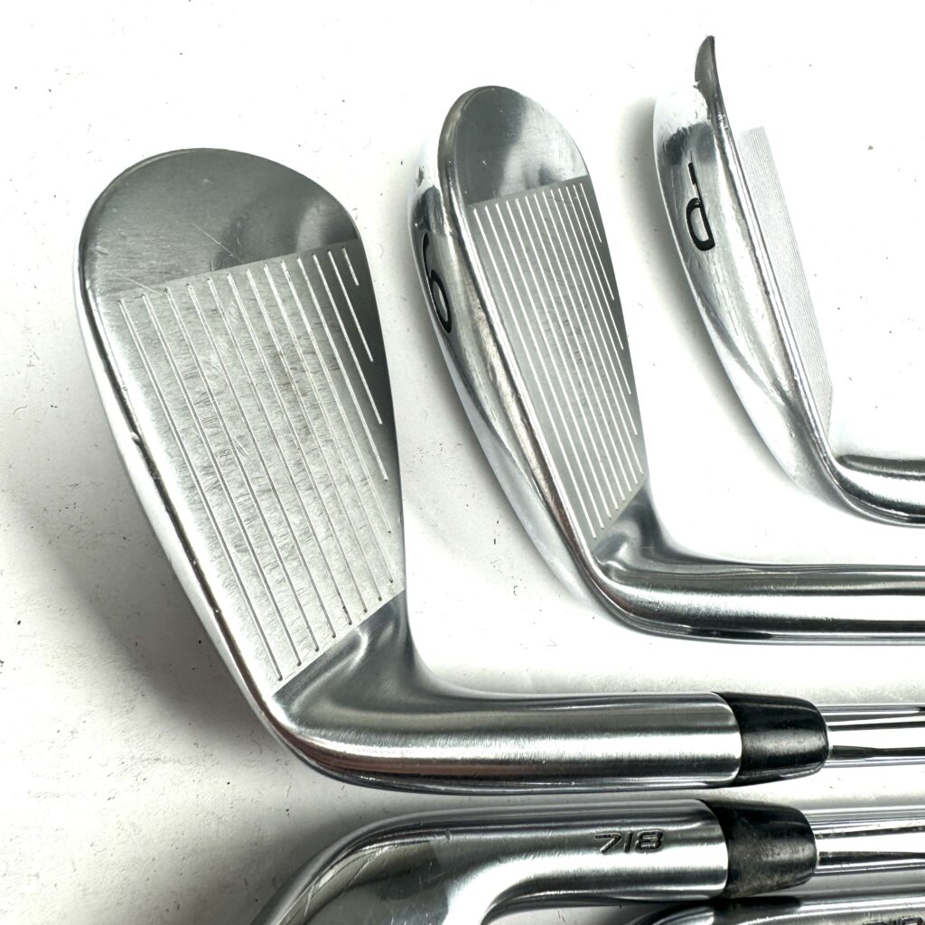 The 718 CB irons feature a forged 1025 carbon steel body combined with a high-density tungsten weight positioned in the perimeter of the clubhead. This design enhances forgiveness by increasing the moment of inertia (MOI) and lowering the center of gravity (CG), which helps achieve more consistent ball flights and higher launch angles on off-center hits. The deep cavity back design contributes to improved stability and distance, while still providing a solid feel and responsive feedback.